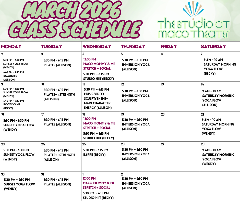 Event Space Rental Historic charm meets modern amenities for events up to 250 people Learn More Historic Art Deco Design Original architecture to the theater, dating back to the 1920s Learn More Unique Amenities Equipped with anything you could need and more for your special event Read More Upcoming Community Events Featured Mar 4 Mar 4, 2026 12:00 PM – 1:30 PM12:00 – 13:3012:00 PM – 1:30 PM Mommy & Me Stretch + Social Mar 4, 2026 12:00 PM – 1:30 PM12:00 – 13:3012:00 PM – 1:30 PM Mar 4, 2026 12:00 PM – 1:30 PM12:00 – 13:3012:00 PM – 1:30 PM Mar 18 Mar 18, 2026 12:00 PM – 1:30 PM12:00 – 13:3012:00 PM – 1:30 PM Mommy & Me Stretch + Social Mar 18, 2026 12:00 PM – 1:30 PM12:00 – 13:3012:00 PM – 1:30 PM Mar 18, 2026 12:00 PM – 1:30 PM12:00 – 13:3012:00 PM – 1:30 PM Apr 1 Apr 1, 2026 12:00 PM – 1:30 PM12:00 – 13:3012:00 PM – 1:30 PM Mommy & Me Stretch + Social Apr 1, 2026 12:00 PM – 1:30 PM12:00 – 13:3012:00 PM – 1:30 PM Apr 1, 2026 12:00 PM – 1:30 PM12:00 – 13:3012:00 PM – 1:30 PM Fitness Classes @ Maco Theater Book Class Online Now! View Our Monthly Class Calendar View Package Options Immersion Yoga Schedule Featured Mar 19 Mar 19, 2026 The Body as Archive Immersion Yoga Mar 19, 2026 Mar 19, 2026 Thanks for helping us keep Maco Theater history alive!