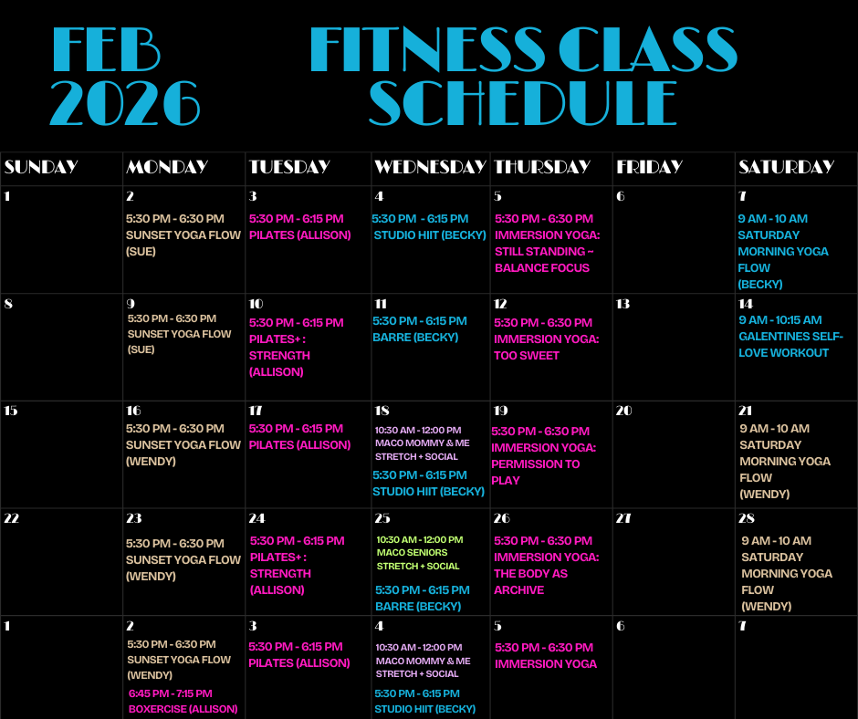 Event Space Rental Historic charm meets modern amenities for events up to 250 people Learn More Historic Art Deco Design Original architecture to the theater, dating back to the 1920s Learn More Unique Amenities Equipped with anything you could need and more for your special event Read More Upcoming Community Events Featured Feb 14 Feb 14, 2026 9:00 AM – 10:15 AM09:00 – 10:159:00 AM – 10:15 AM Galentine's Self-Love Workout Feb 14, 2026 9:00 AM – 10:15 AM09:00 – 10:159:00 AM – 10:15 AM Feb 14, 2026 9:00 AM – 10:15 AM09:00 – 10:159:00 AM – 10:15 AM Feb 18 Feb 18, 2026 10:30 AM – 12:00 PM10:30 – 12:0010:30 AM – 12:00 PM Mommy & Me Stretch + Social Feb 18, 2026 10:30 AM – 12:00 PM10:30 – 12:0010:30 AM – 12:00 PM Feb 18, 2026 10:30 AM – 12:00 PM10:30 – 12:0010:30 AM – 12:00 PM Feb 25 Feb 25, 2026 10:30 AM – 12:00 PM10:30 – 12:0010:30 AM – 12:00 PM Senior Stretch & Social Feb 25, 2026 10:30 AM – 12:00 PM10:30 – 12:0010:30 AM – 12:00 PM Feb 25, 2026 10:30 AM – 12:00 PM10:30 – 12:0010:30 AM – 12:00 PM Fitness Classes @ Maco Theater Book Class Online Now! View Our Monthly Class Calendar View Package Options Immersion Yoga Schedule Featured Feb 12 Feb 12, 2026 Too Sweet Immersion Yoga Feb 12, 2026 Feb 12, 2026 Feb 19 Feb 19, 2026 Permission to Play Immersion Yoga Feb 19, 2026 Feb 19, 2026 Feb 26 Feb 26, 2026 The Body as Archive Immersion Yoga Feb 26, 2026 Feb 26, 2026 Thanks for helping us keep Maco Theater history alive!