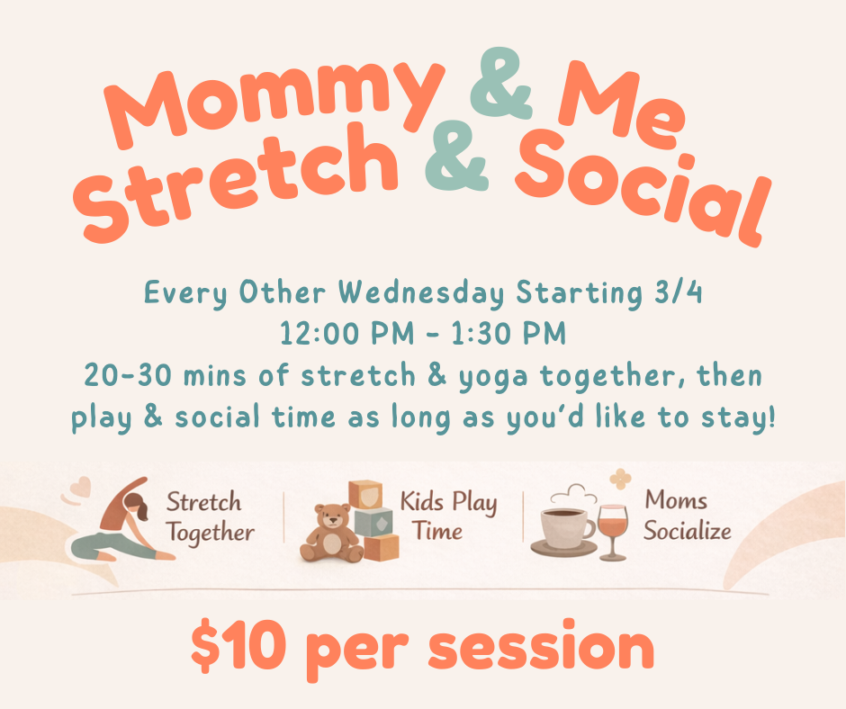Mommy & Me Stretch & Social is all about movement, connection, and building community — one stretch, giggle, and coffee break at a time